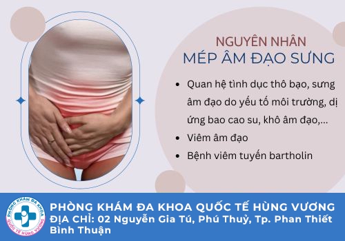 Đối với tình trạng sưng mép âm đạo, các bác sĩ chuyên khoa tại Phòng Khám Đa Khoa Quốc Tế Hùng Vương cho biết, việc triệu chứng này xuất hiện sẽ có liên quan đến một số vấn đề ở sức khỏe nữ giới bao gồm: